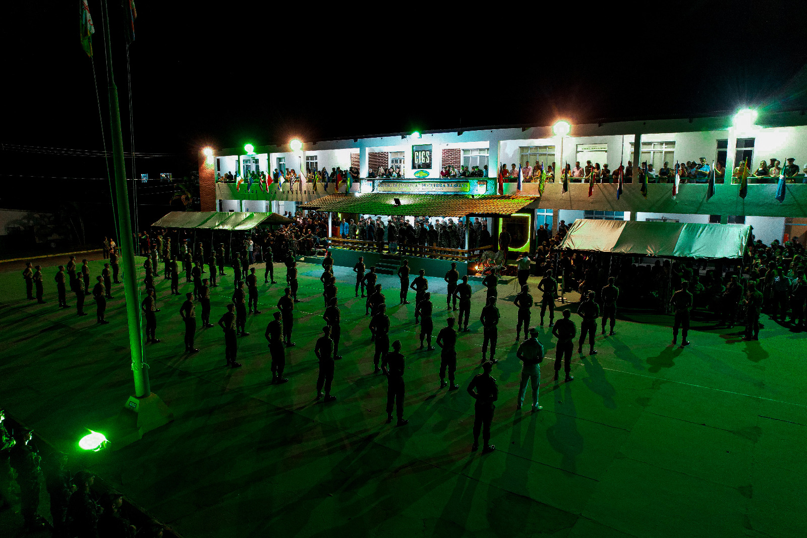 À noite, ocorreu a solenidade de Brevetação, presidida pelo Comandante Militar da Amazônia, General de Exército Ricardo Augusto Ferreira Costa Neves, que contou, ainda, com a presença do General de Divisão Alan Denilson Lima Costa, Comandante de Defesa Cibernética; do General de Divisão Helder de Freitas Braga, Secretário-Executivo de Coordenação de Ações de Assistência Emergencial; do General de Brigada Washington Rocha Triani, Chefe do Estado-Maior do Comando Militar da Amazônia; do General de Brigada Luís Cláudio Brion Cardoso, Comandante do 2º Grupamento de Engenharia; do General de Brigada R/1 Algacir Antonio Polsin; de autoridades civis e militares; de Eternos Comandantes do CIGS; de Comandantes de Organizações Militares; de antigos integrantes e pioneiros do CIGS, conhecidos como as “Velhas Onças”; e de familiares e amigos dos concludentes. Durante a solenidade, foram cumprimentados os destaques gerais do curso: o Aspirante a Oficial de Infantaria Fábio Luís dos Santos Geraldo, aluno 26 do COS “B”, do Comando de Fronteira Roraima / 7º Batalhão de Infantaria de Selva; e o 3º Sargento de Infantaria João Paulo Carvalho Vilela, aluno 114 do COS “C”, do Comando de Fronteira Solimões / 8º Batalhão de Infantaria de Selva. Eles foram elogiados pelas autoridades militares por seu desempenho e contribuição para o cumprimento das missões recebidas durante o curso.