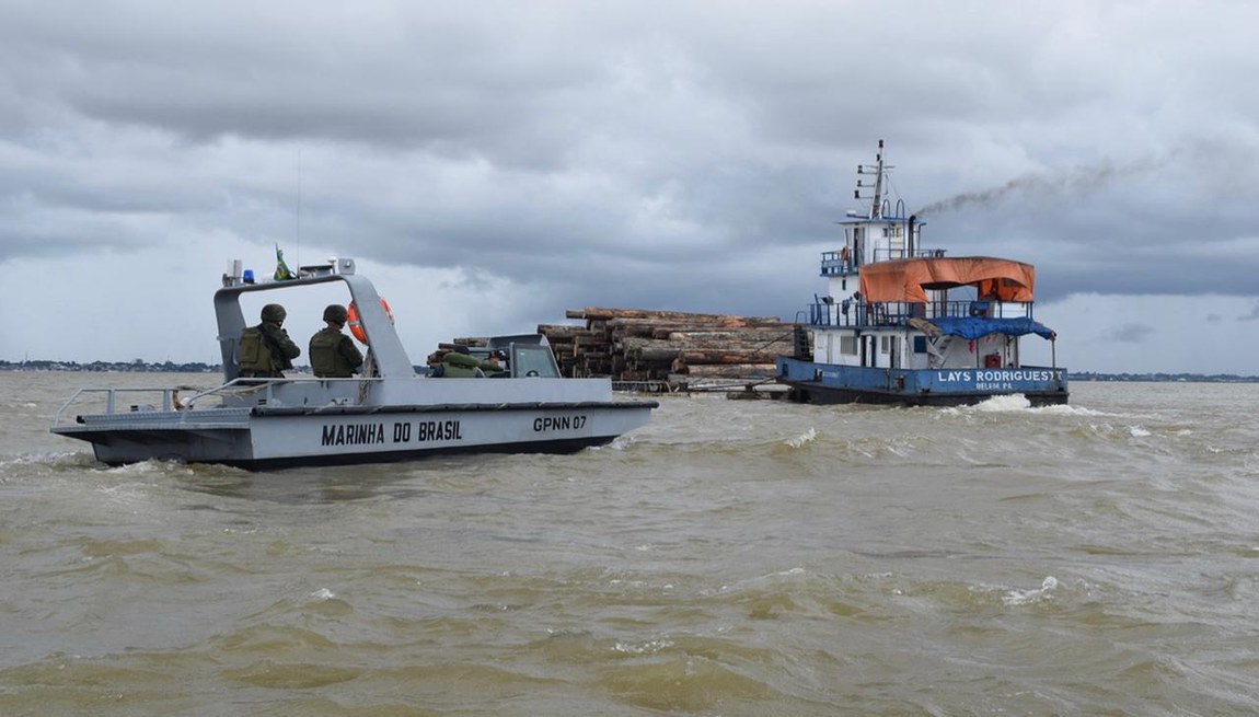 Militares da Marinha apreenderam empurrador com duas balsas com toras de madeira próxima ao Distrito de Icoaraci, em Belém, no Pará, durante patrulha e inspeção naval. A ação foi nesta sexta-feira (12/2), por integrantes do Comando Conjunto Norte, a bordo do Navio Patrulha Bracuí, e faz parte da Operação Verde Brasil 2 de combate a ilícitos ambientais.