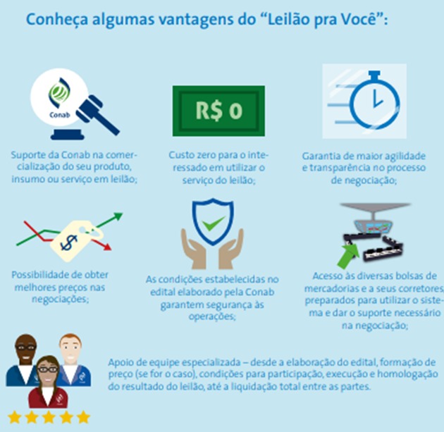 “O sistema de leilões da Companhia é virtual, seguro, transparente e oferece visibilidade em todo o território nacional”, ressalta o superintendente de Operações Comerciais da Conab, Rogério Gonçalves. “Isso dá ao demandante a possibilidade de conseguir melhores negociações de produtos, serviços e insumos do setor agropecuário”.