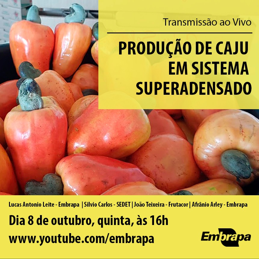 Ocorrerá nesta quinta-feira (8) a partir das 16 horas, a transmissão sobre um experimento com cultivo superadensado de cajueiro-anão. O estudo chegou a obter, em dois anos de implantação, o triplo da produtividade média alcançada pela variedade no estado do Ceará em 2019.
