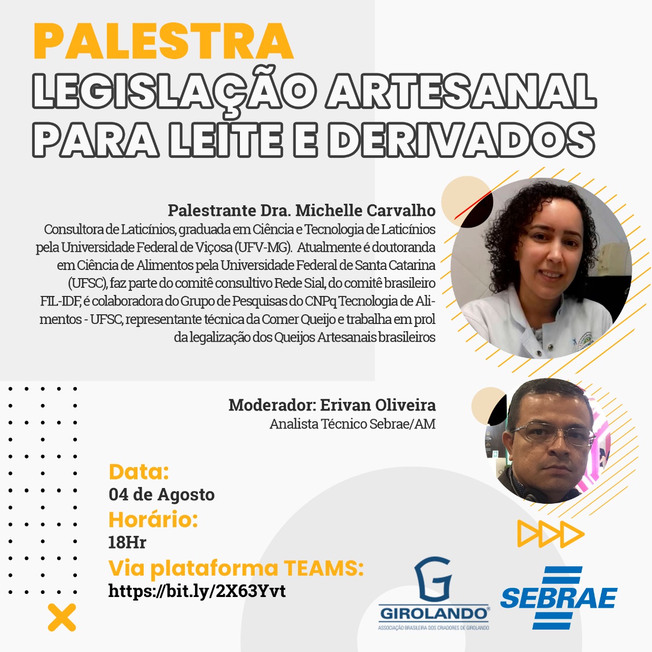 No dia 04/08 às 18h a Sebrae oferece palestra com a Dra. Michelle Carvalho, especialista na legislação artesanal de leites e derivados