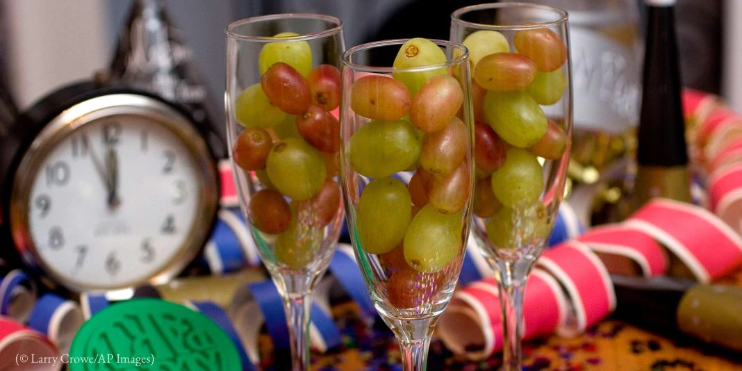 Na Espanha, as pessoas têm o costume de comer 12 uvas à meia-noite, uma para cada batida do relógio, o objetivo é comê-las antes do início do ano novo. Alguns acreditam que a doçura de cada uva prevê como cada mês será. Por exemplo: se a terceira uva é amarga, significa que o mês de março pode ser difícil. Essa Tradição começou no em 1909, quando houve uma grande produção da fruta no país.