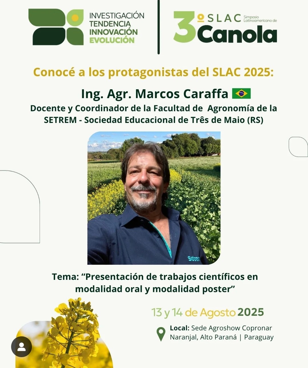 O Engenheiro Agrônomo Marcos Caraffa, professor e coordenador da Faculdade de Agronomia da SETREM – Sociedade Educacional de Três de Maio (RS), na qual liderou a apresentação de trabalhos científicos na modalidade oral e modalidade poster.