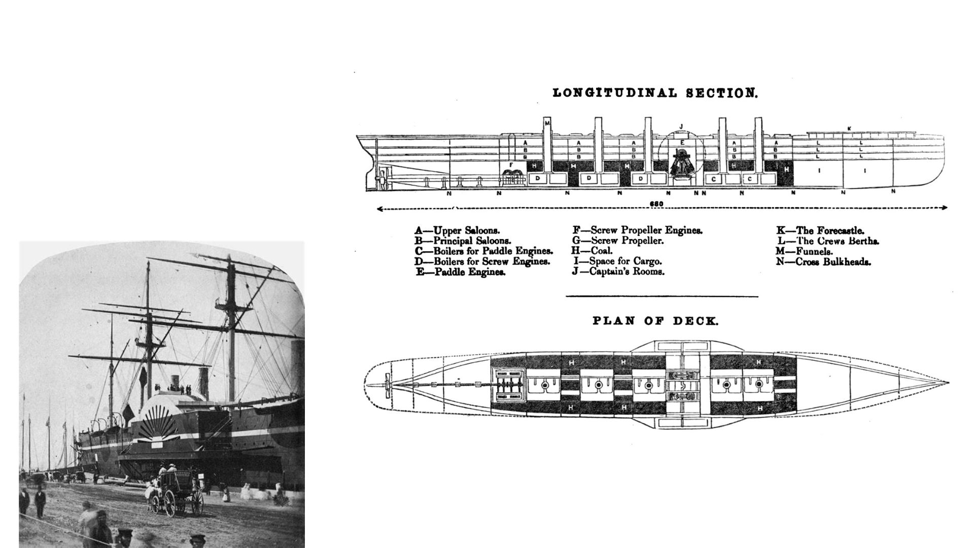 O Great Eastern entrou para a história como uma das maiores obras de engenharia naval do século XIX. Com impressionantes 211 metros de comprimento, casco duplo de ferro e um sistema de propulsão híbrido que combinava velas, rodas de pás e hélice, a embarcação superava qualquer outro navio de sua época em tamanho e ambição tecnológica.