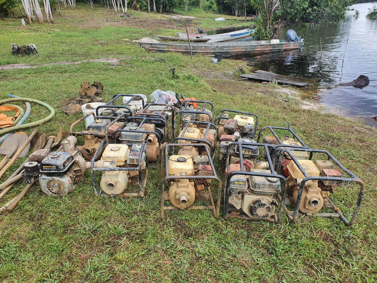 Após a abordagem, foram recolhidos os seguintes materiais: 14 (quatorze) bombas submersas – tipo sapo, duas motosserras, duas espingardas (36 e 16), 13 munições de Cal 16,5, cinco metros de mangueira de grande calibre, ferramentas diversas de sapa (pá, picareta, enxada) e 10 quilos de VIVIANITA. A equipe do 3º BIS continua patrulhando o local em busca de mais material ilícito e de informações.