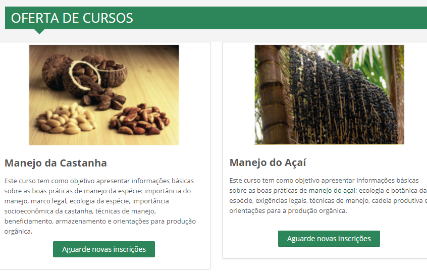 São ofertados 10 cursos, de educação a distância, relacionados ao cultivo florestal de castanha e açaí, ao manejo florestal de madeira, à técnica de exploração de impacto reduzido, à gestão de organizações comunitárias (associações e cooperativas), às concessões florestais, à silvicultura de espécies florestais nativas e à experiência de manejo florestal comunitário.
