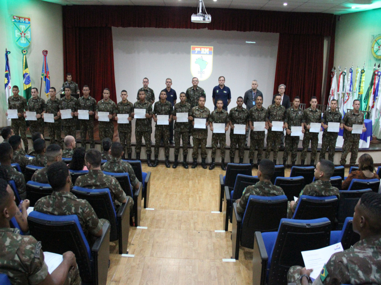 Recife (PE) – A 7ª Região Militar do Exército Brasileiro diplomou 125 militares pelo Projeto Soldado Cidadão. A cerimônia de entrega dos diplomas foi realizada no auditório do Colégio Militar do Recife, na manhã do dia 6 de dezembro. Cabos e soldados concluíram cursos de eletricista de automóveis, eletricista instalador predial de baixa tensão, pintura automotiva, torneiro mecânico e programador de sistemas. A 7ª Região Militar foi destaque na condução do Projeto.