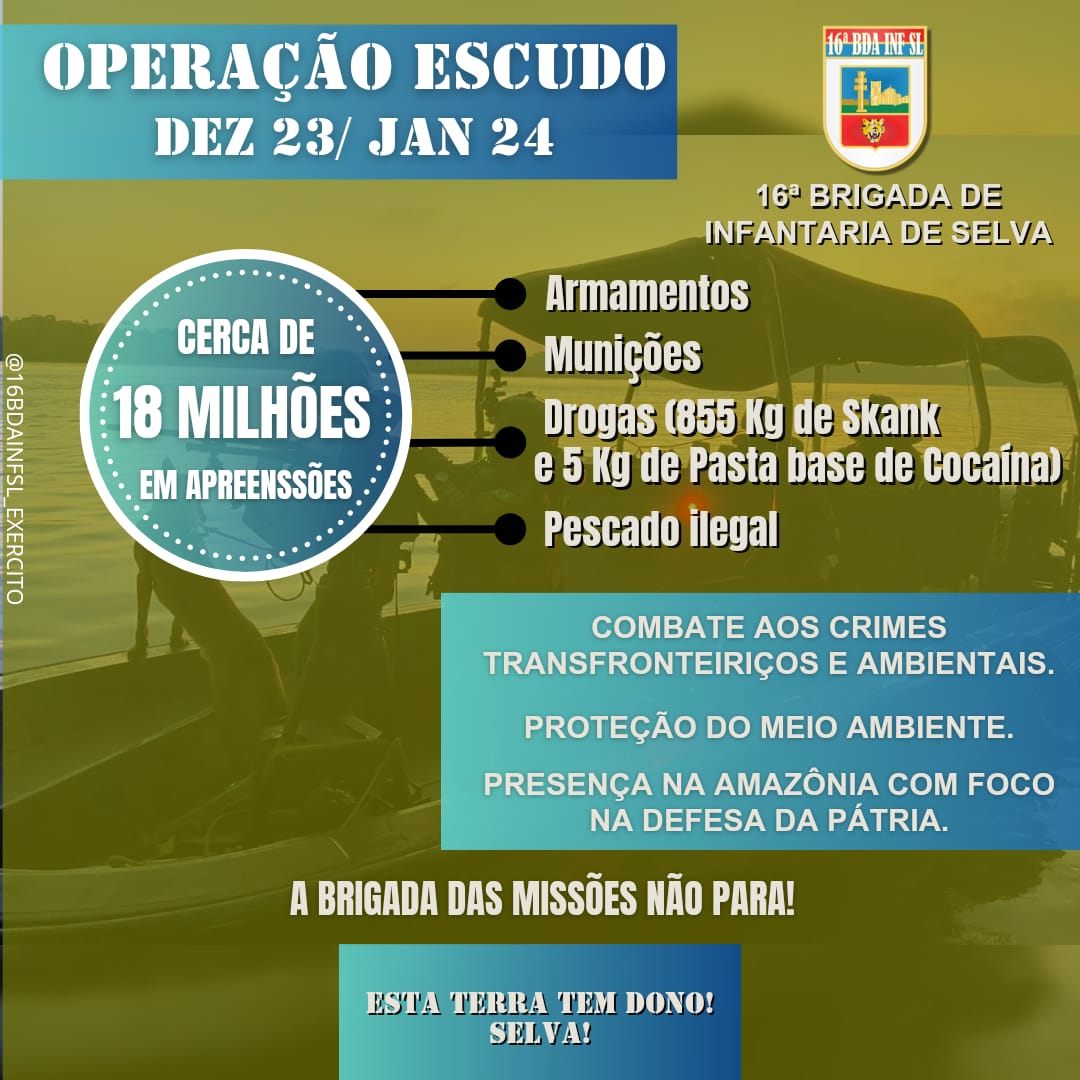 Durante os meses de dezembro de 2023 e de janeiro de 2024, a 16ª Brigada de Infantaria de Selva (16ª Bda Inf Sl) demonstrou sua prontidão operacional na Operação Escudo, colaborando com o Comando Militar da Amazônia no combate ao narcotráfico, crimes transfronteiriços e ambientais, na proteção do meio ambiente e fortalecendo a Defesa da Pátria nos “Rincões da Amazônia”.