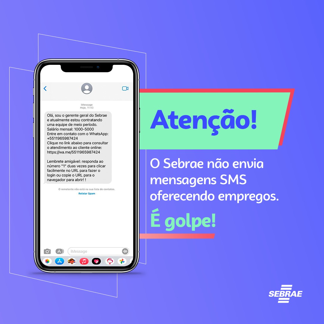 Caso você receba por SMS, e-mail ou WhatsApp com esse conteúdo criminoso, utilizando o nome do Sebrae, não clique, não responda, não crie conta comercial, não aceite participar desta seleção.