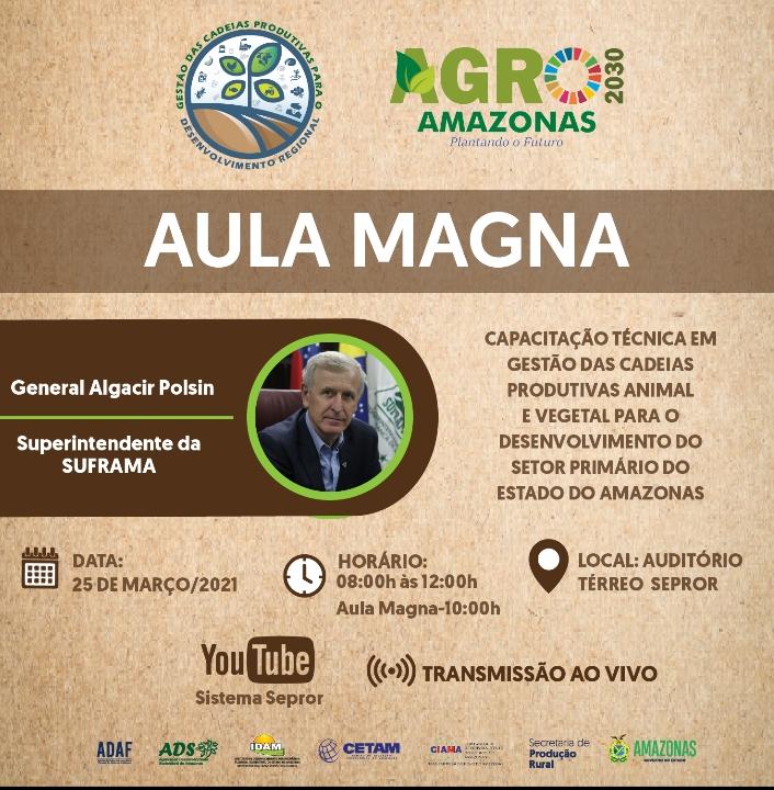 Terá início, nesta quinta-feira (25/3), o curso de Capacitação Técnica em Gestão das Cadeias Produtivas Animal e Vegetal para o Desenvolvimento do Setor Primário do Estado do Amazonas, com Aula Magna, das 8h às 12h, ministrada pelo superintendente da Zona Franca de Manaus, general Algacir Polsin, e comandada pela Sepror (Secretaria de Estado de Produção Rural) e pela Ciama (Companhia de Desenvolvimento do Estado do Amazonas).